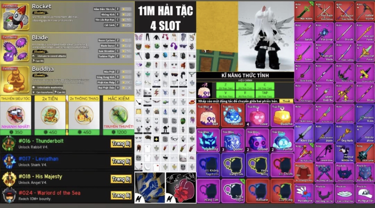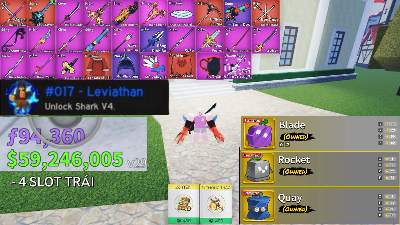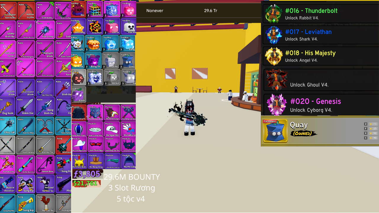 Acc Blox Fruits 29.6M bounty, 3 slot rương, mở V4 Rabbit, Shark, Angel, Ghoul, Cyborg, có trái vĩnh viễn Spin (Quay), sở hữu kiếm đỏ/kiếm mạnh gồm Cursed Dual Katana (CDK), Hallow Scythe, Buddy Sword, Fox Lamp, Saber, Tushita, Yama, Rengoku, Midnight Blade, Pole (1st & 2nd Form), Cavander, Gravity Blade, Dual-Headed Blade, kèm nhiều súng, phụ kiện và trái trong kho.: